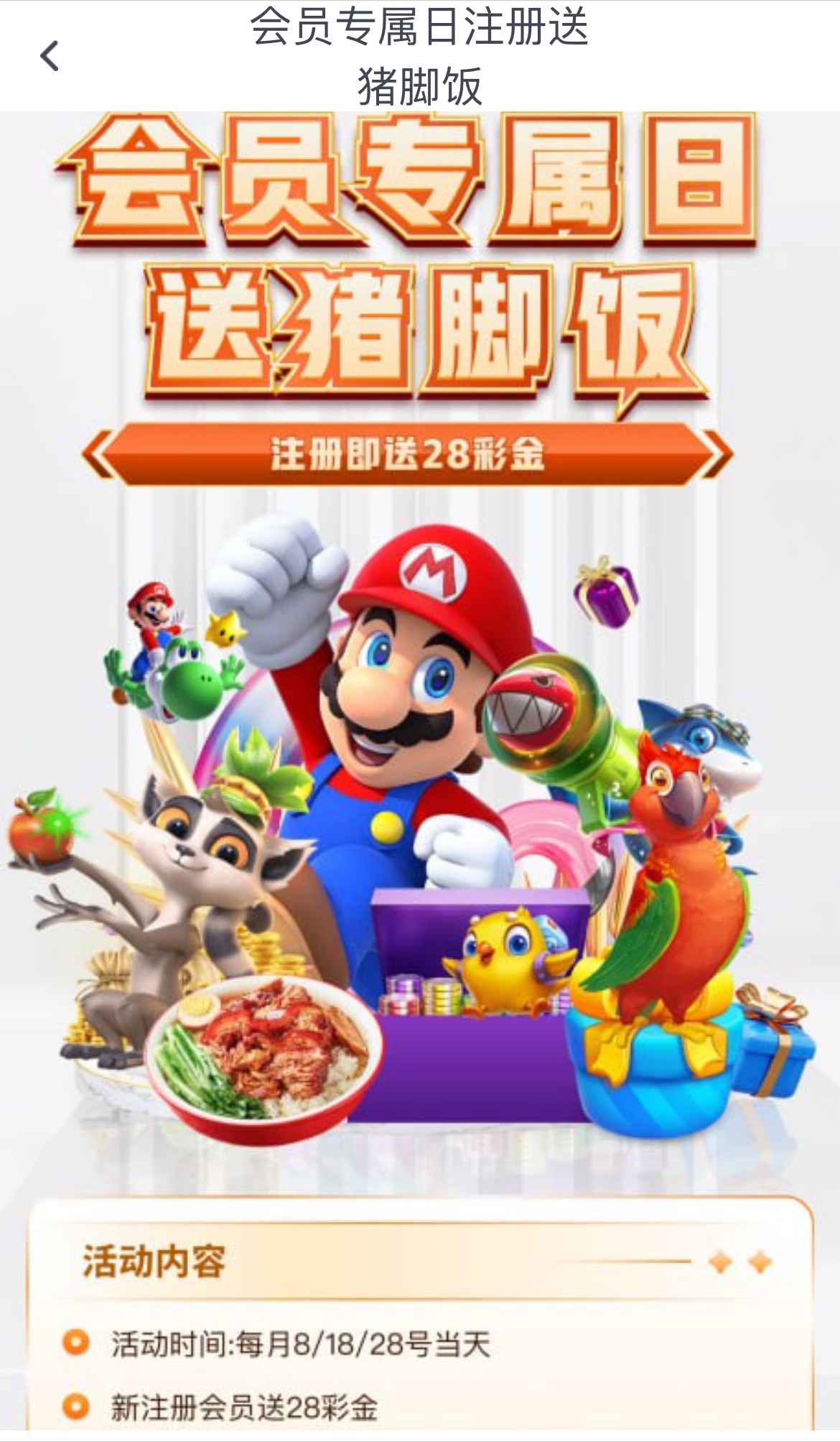 每月8号18号28号当天注册的送28彩金,新用户注册绑定手机号/银行卡/支付宝在优惠大厅申请,72小时内送,限28类游戏/捕鱼,10倍流水,满288提现,下分只能用银行卡/支付宝/k豆