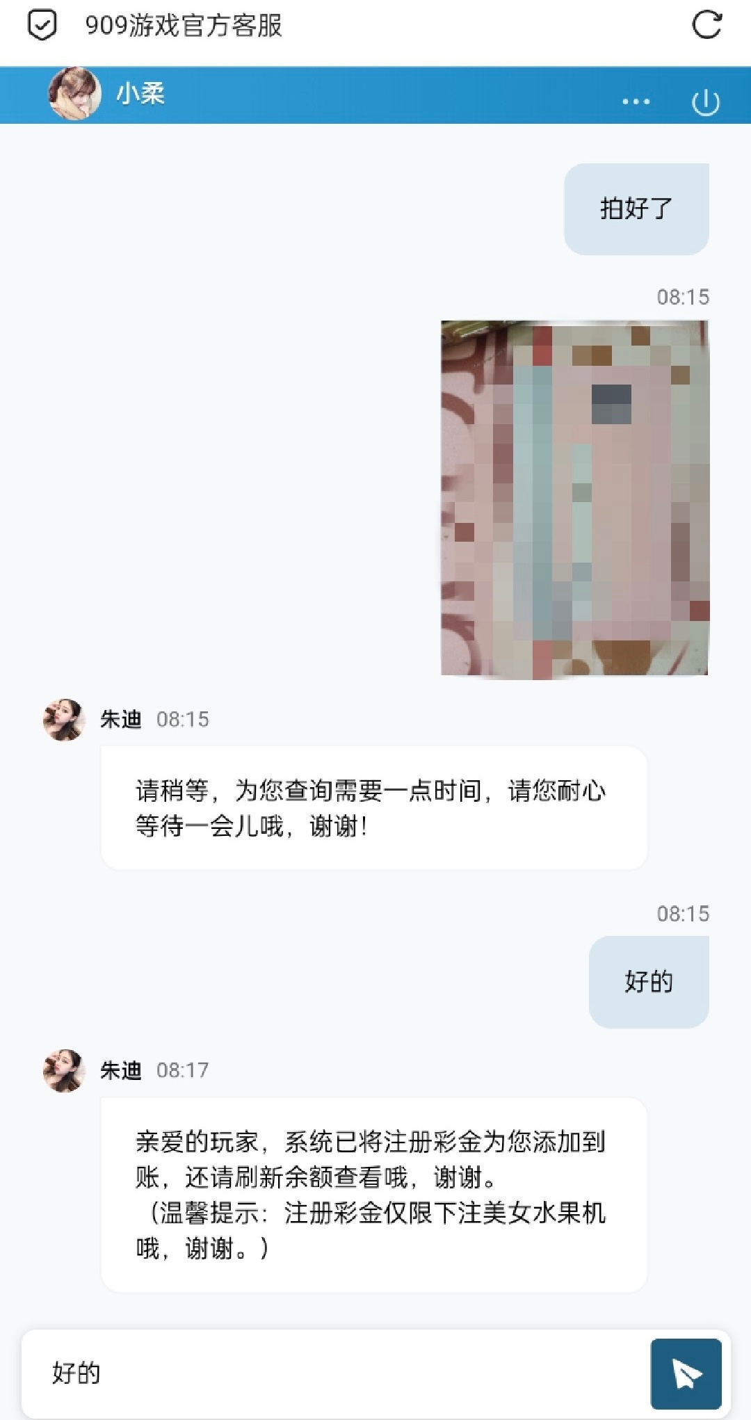 先打开六合宝典然后进入页面 有两个909一个是909彩票一个 往下滑还有一个909游戏 两个都可以申请 先截图进入链接注册后联系客服 领取18注册彩金 需要提供银行卡照片 介意的可以不要去了 限制玩美女水果机 10倍水