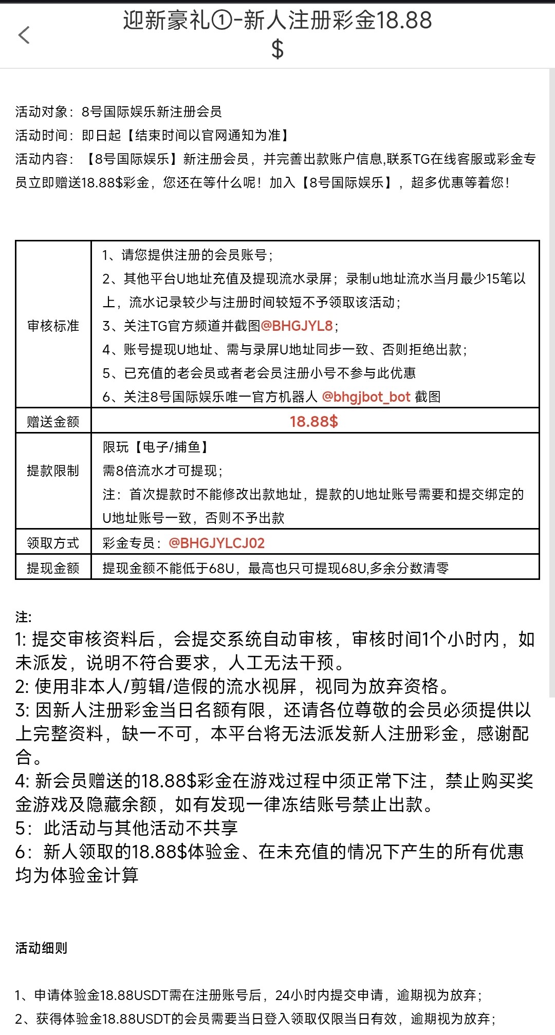 8倍流水,仅限娱乐电子/捕鱼,高低只能提款68U