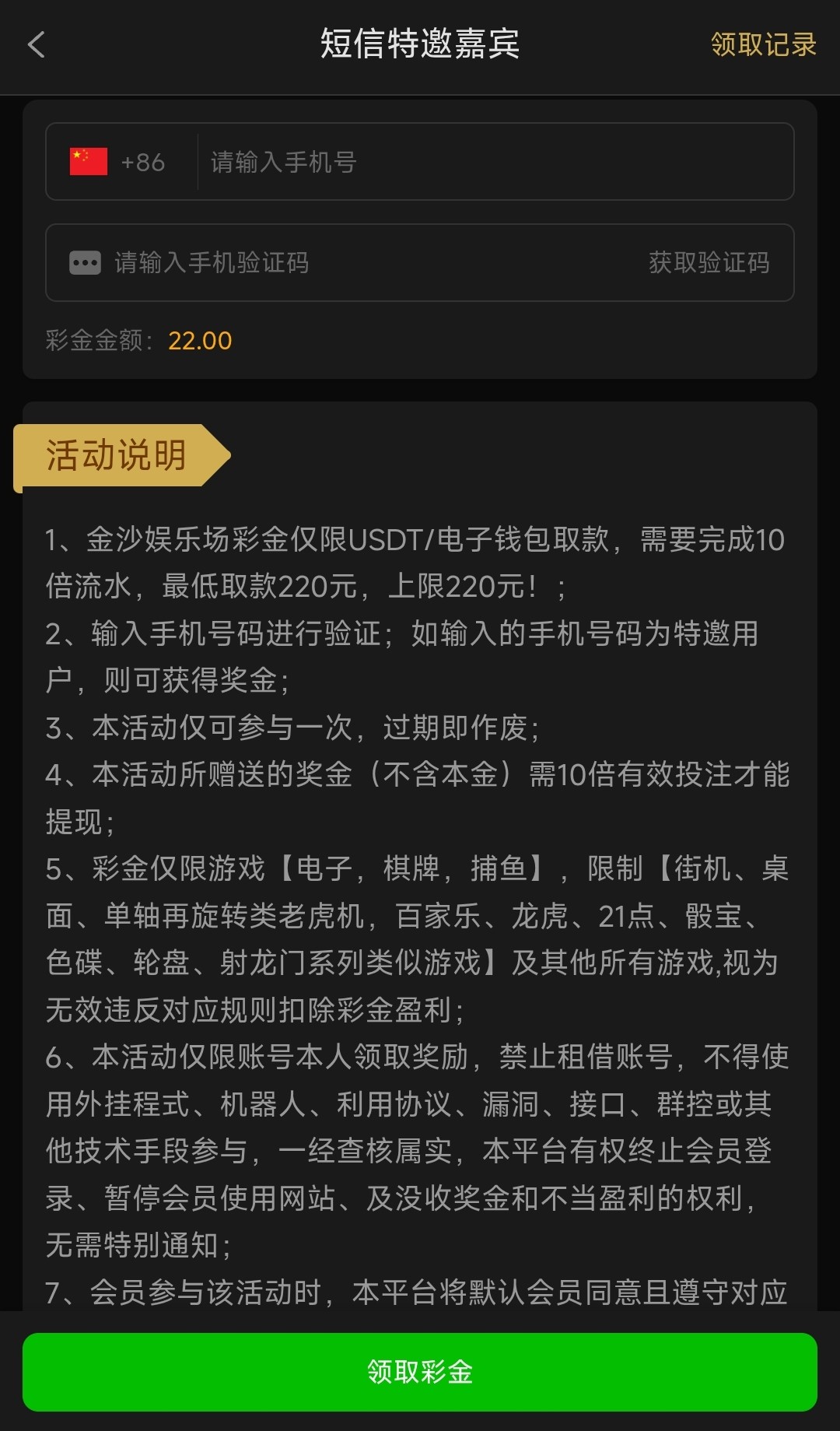 还没玩过可以注册到优惠里自助申请领取,有号并且之前领过可以换绑手机号在用原来特邀手机号重新注册这样也可以重新领取,彩金10倍流水,仅限电子/捕鱼/棋牌,高低提款仅限220