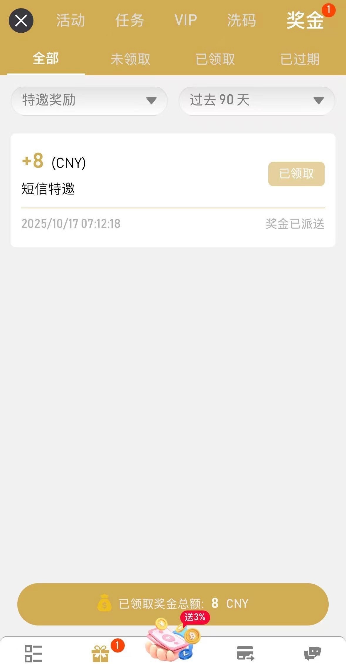 感兴趣的兄弟可以去碰瓷看看自己是不是特邀,仅限电子,10倍流水,满100取款